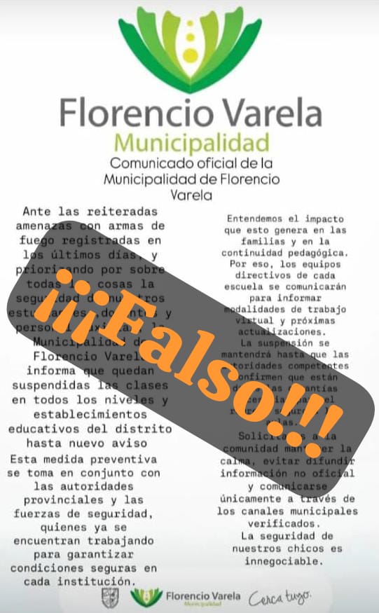 L MUNICIPIO DE FLORENCIO VARELA DESMIENTE INFORMACIÓN FALSA QUE CIRCULA EN REDES SOBRE SUSPENSIÓN DE CLASES